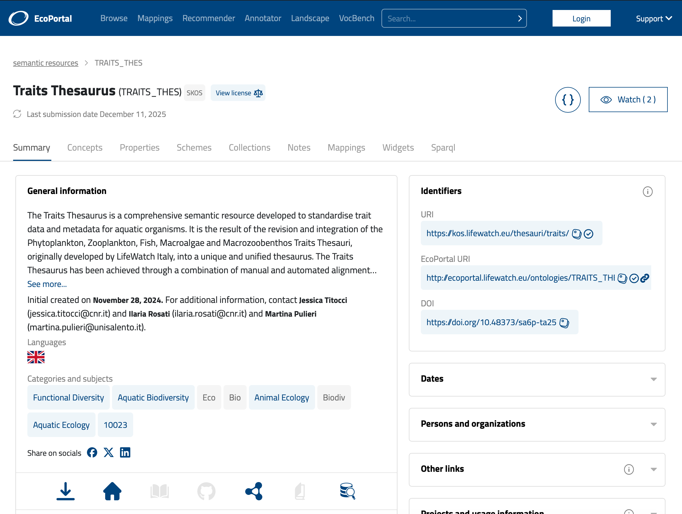 The Traits Thesaurus is a comprehensive semantic resource designed to standardise trait data and metadata for aquatic organisms, including phytoplankton, zooplankton, fish, macroalgae, and macrozoobenthos. It includes a dedicated scheme for phytoplankton traits.